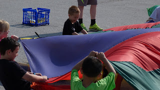 For those in Kindergarten to 4th grade, Field Day is led by our 8th grade students. Part of that is leading the rest of the students in prayer, the pledge of allegiance and the national anthem before we begin. It is also planning and leading all of the games. Students are matched in groups that put them with students from other classes and other grades. Each group is led by two 8th graders who take them from activity to activity.